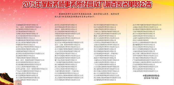 中国注册税务师协会在2016年7月18日举办“2015年度税务师行业收入百强发布会”,中汇税务取得优秀的成绩!